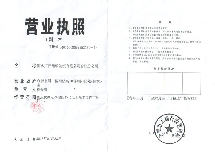 衡水广怀运输物流有限公司合肥分公司营业执照(副本)